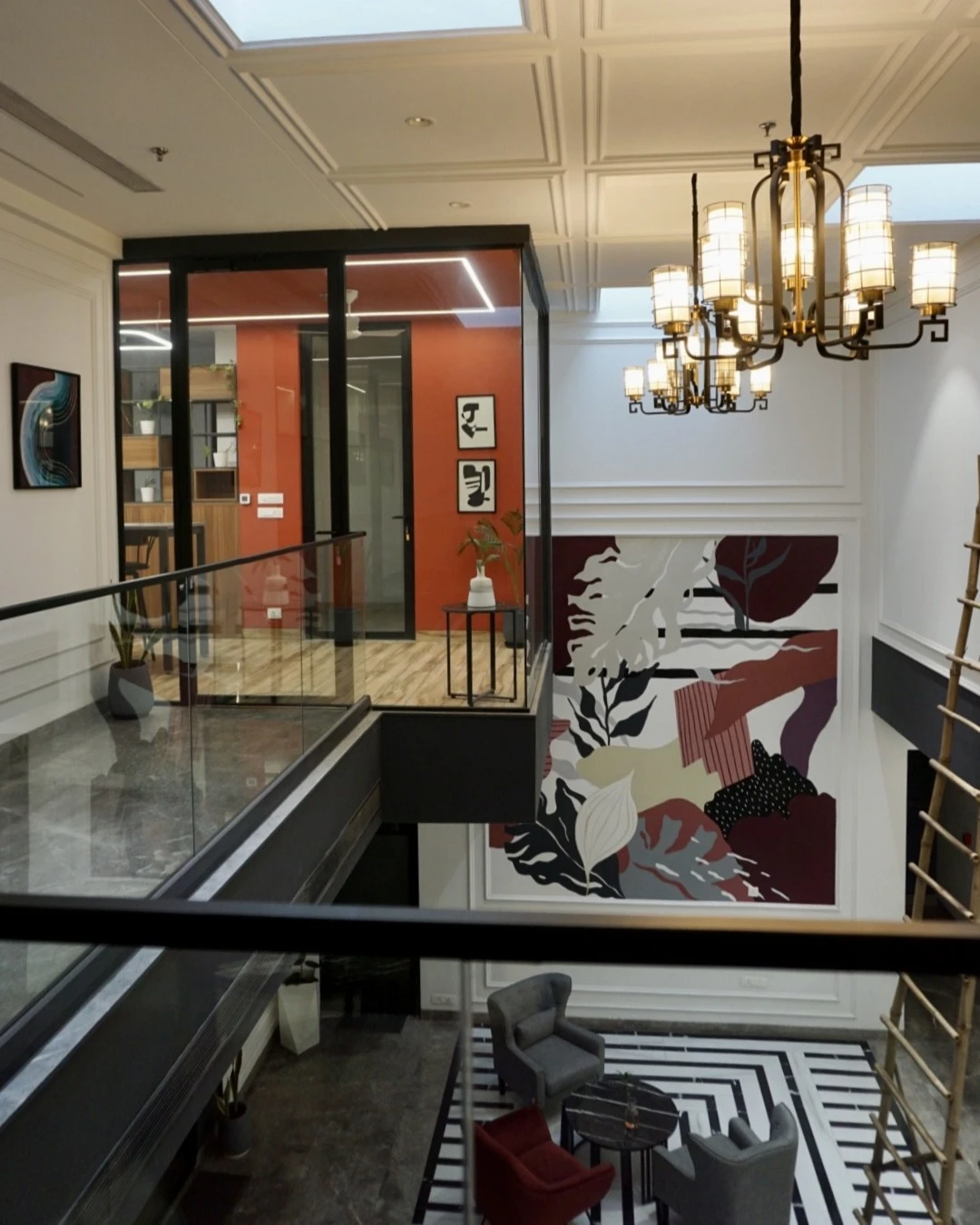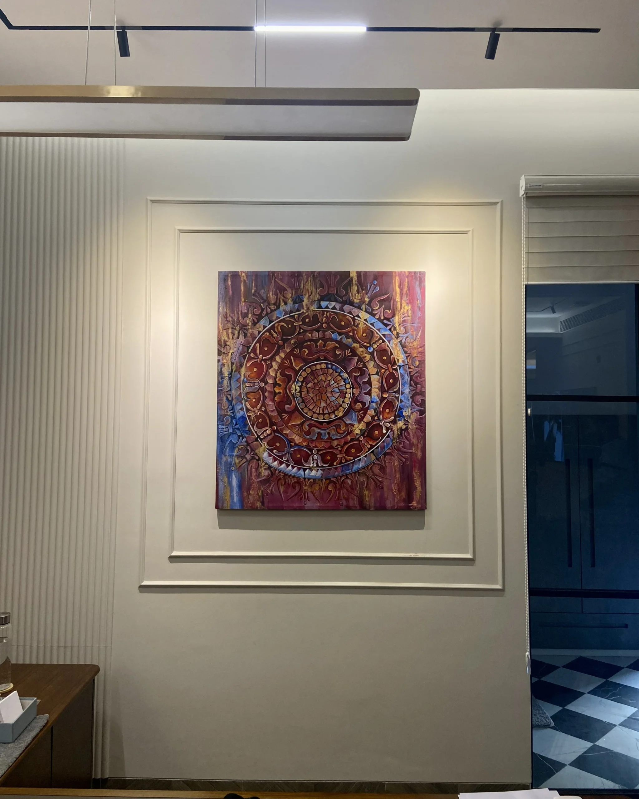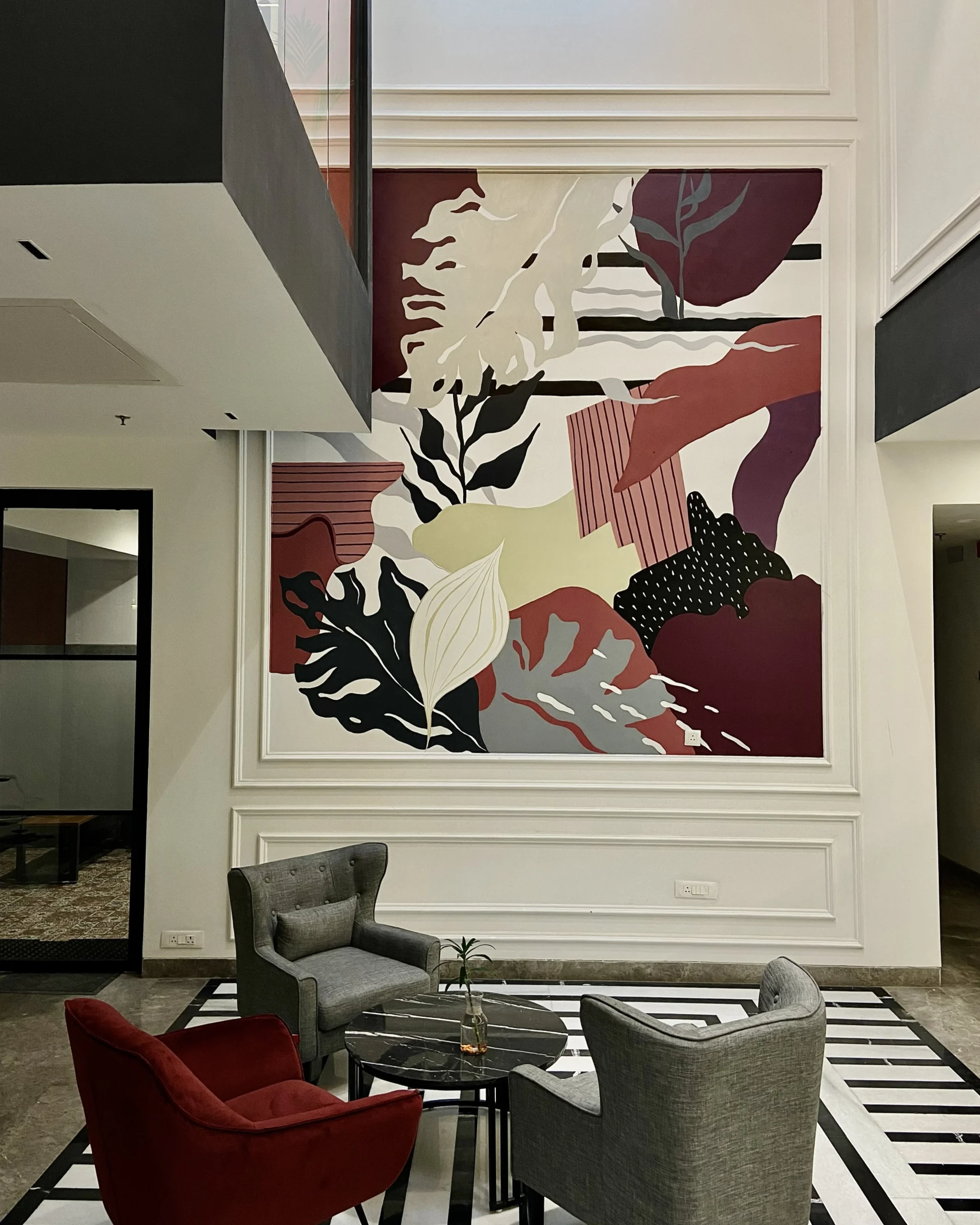 A large-scale abstract botanical mural anchors the double-height lobby. Flat graphic forms in burgundy, cream and black, layered like a collage. Bold enough to hold the full height of the space, considered enough to sit within the architecture. In the conference room, a mandala painting: intricate, warm and quietly centring. Two works, one commission, each finding its right place in the building.