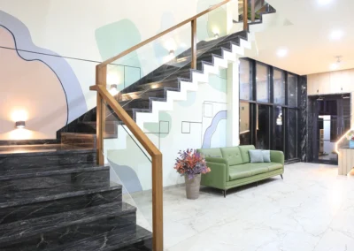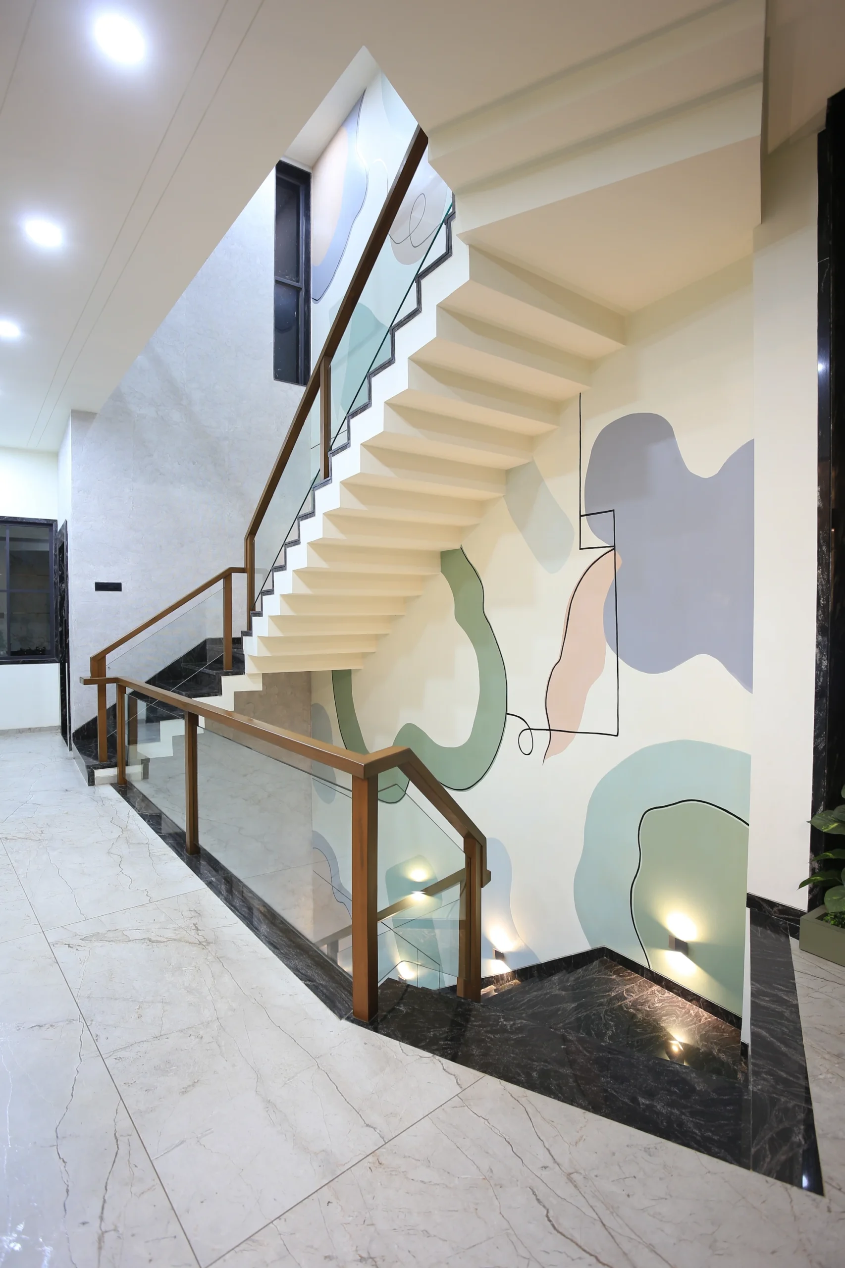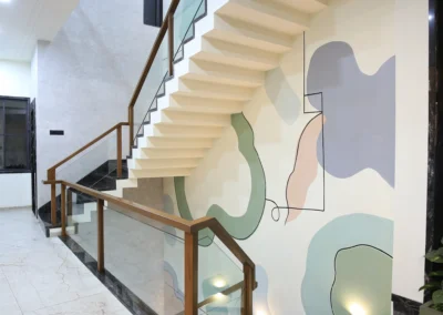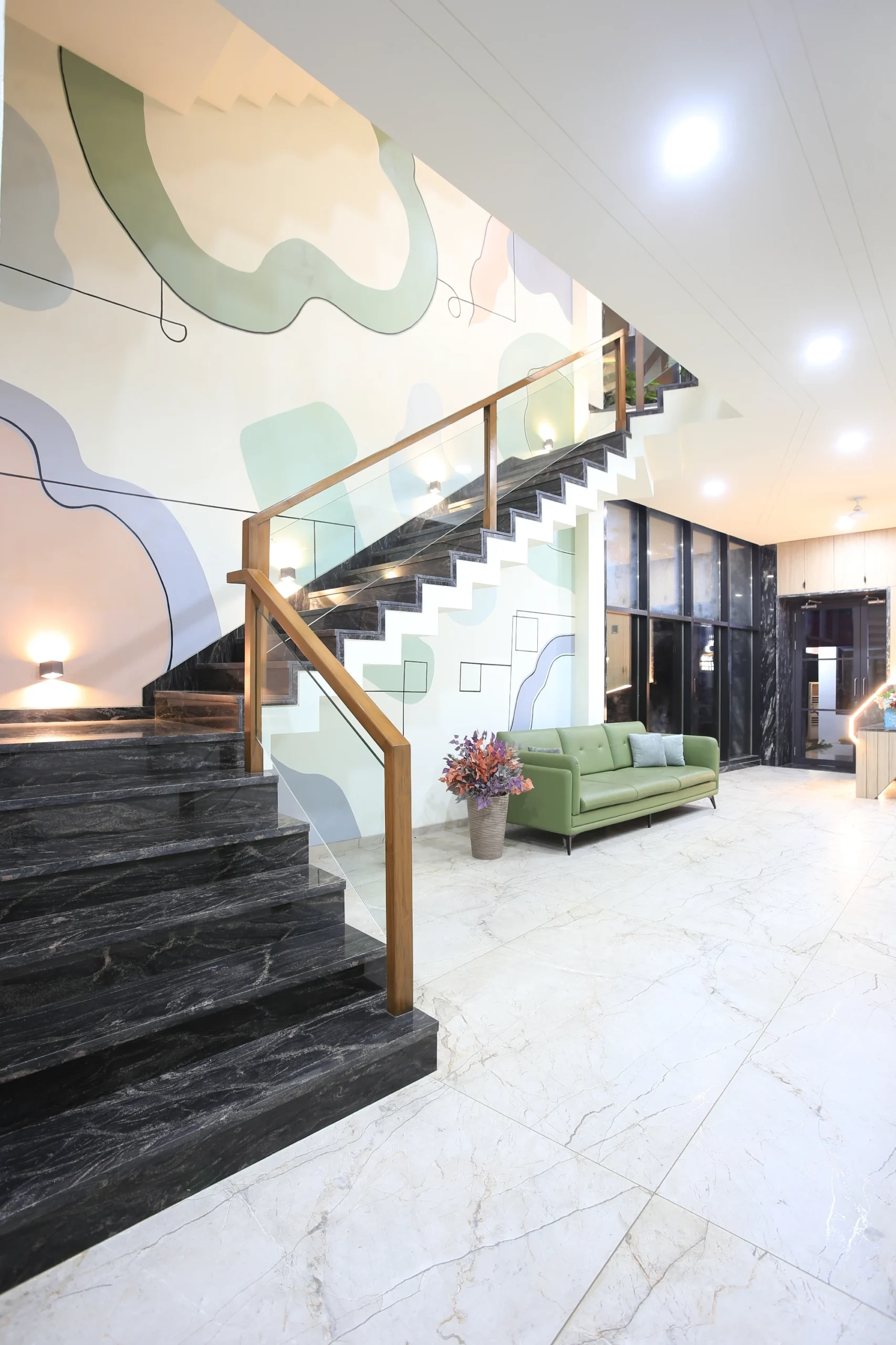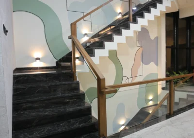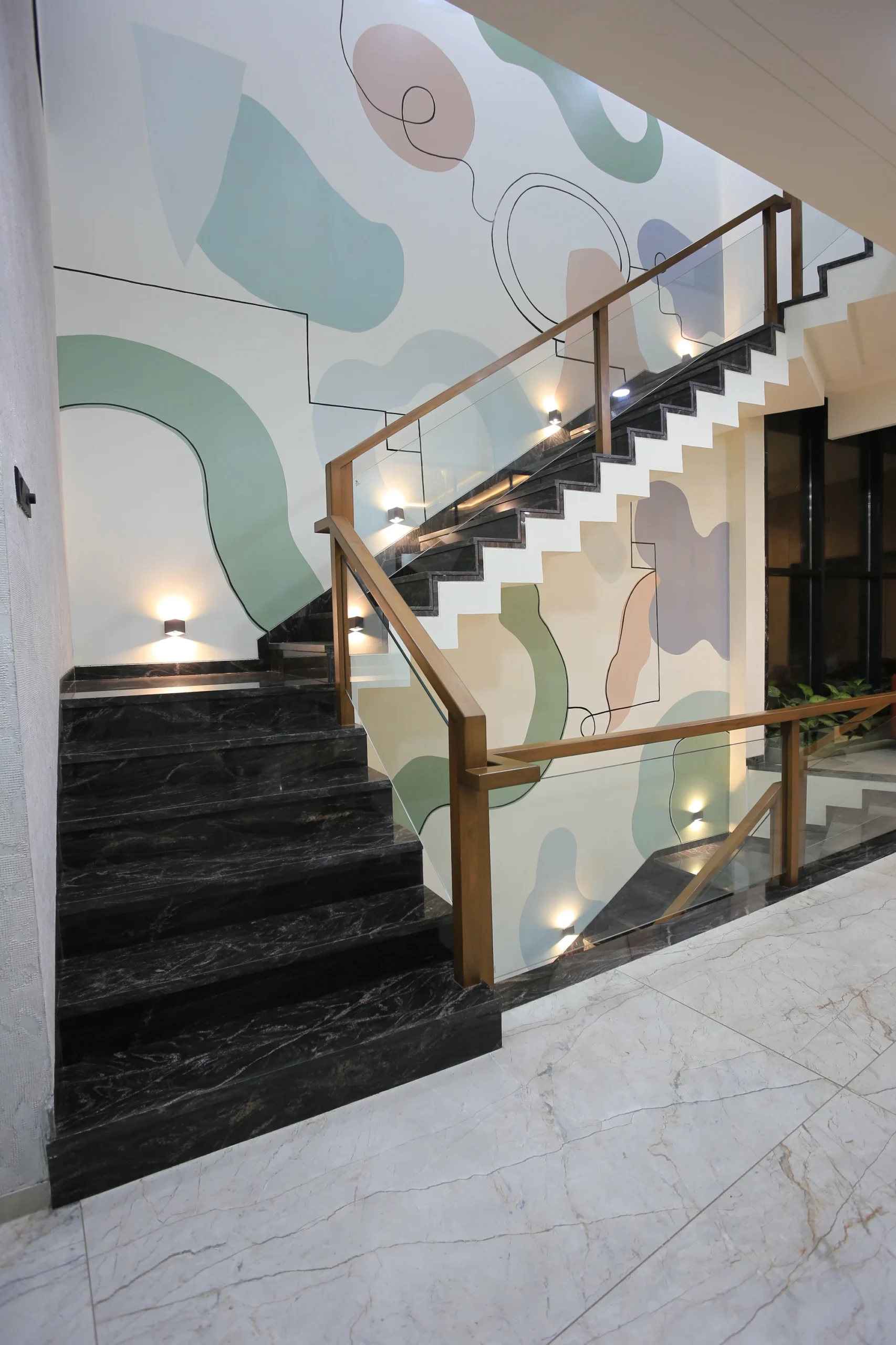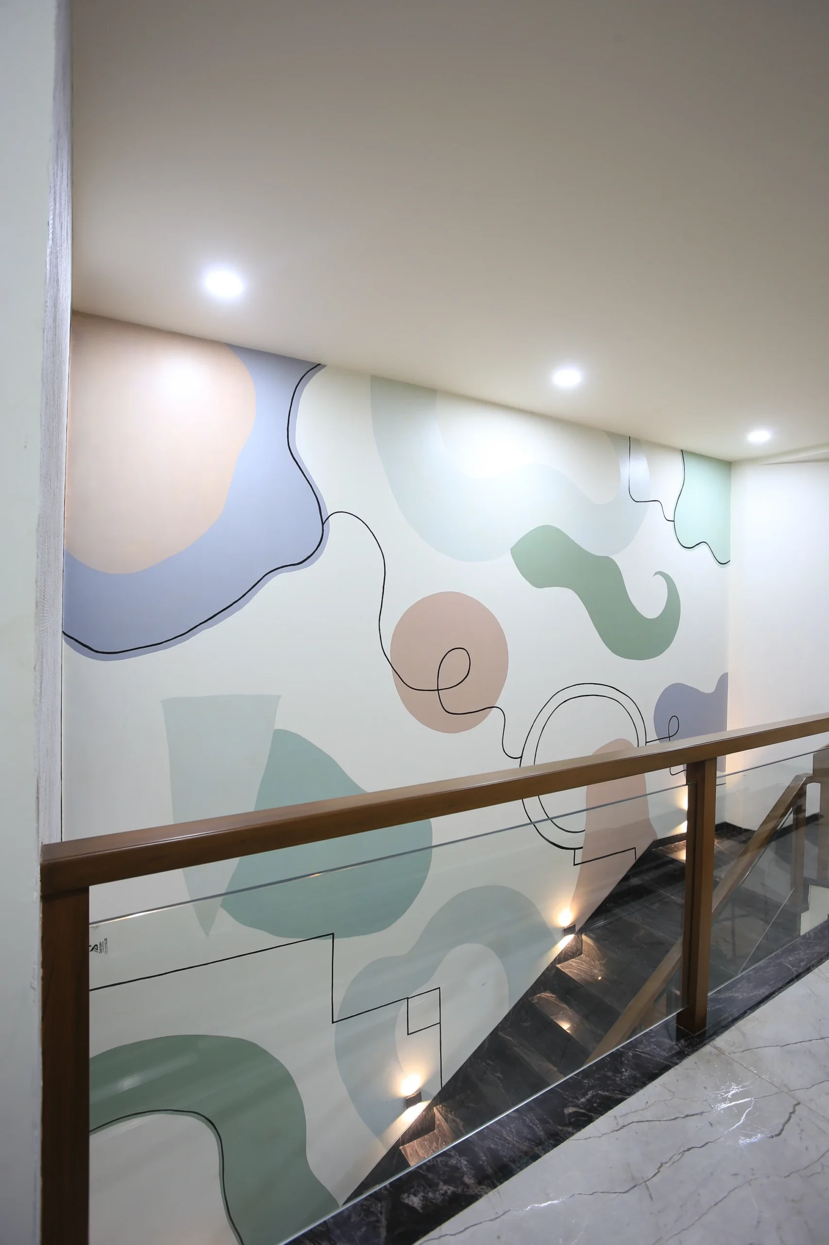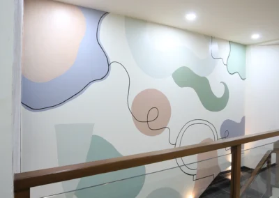 Soft abstract forms in mint, sage, blush and lavender, flowing across three floors of staircase walls. Organic shapes drift between solid and outline: some filled, some traced in thin black line, giving the mural a lightness that climbs with the staircase rather than competing with it. The kind of work that rewards the journey floor by floor.