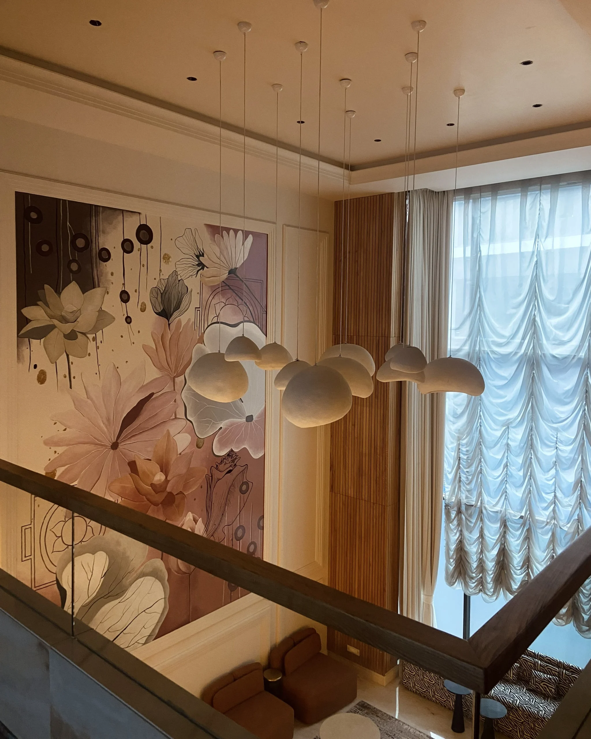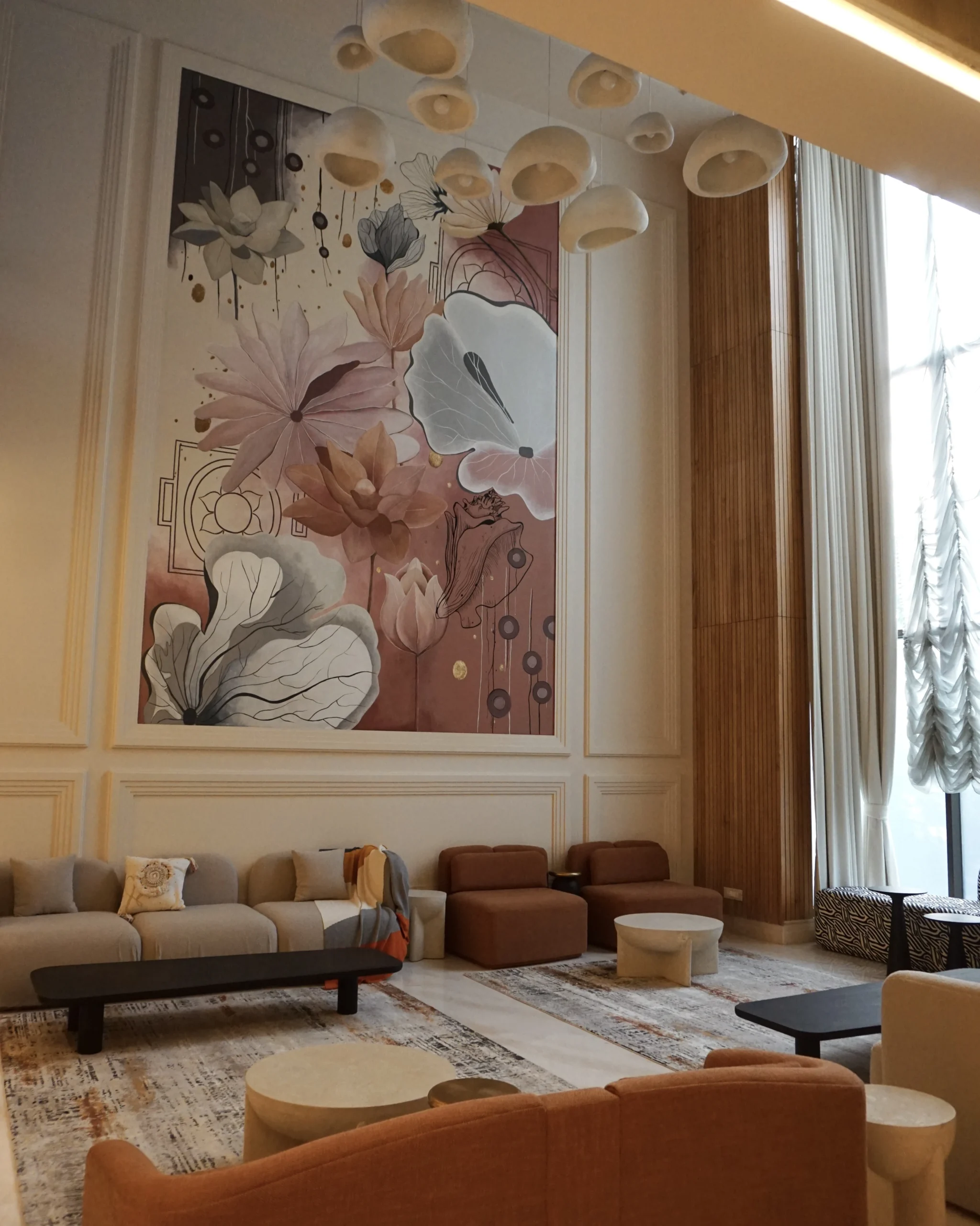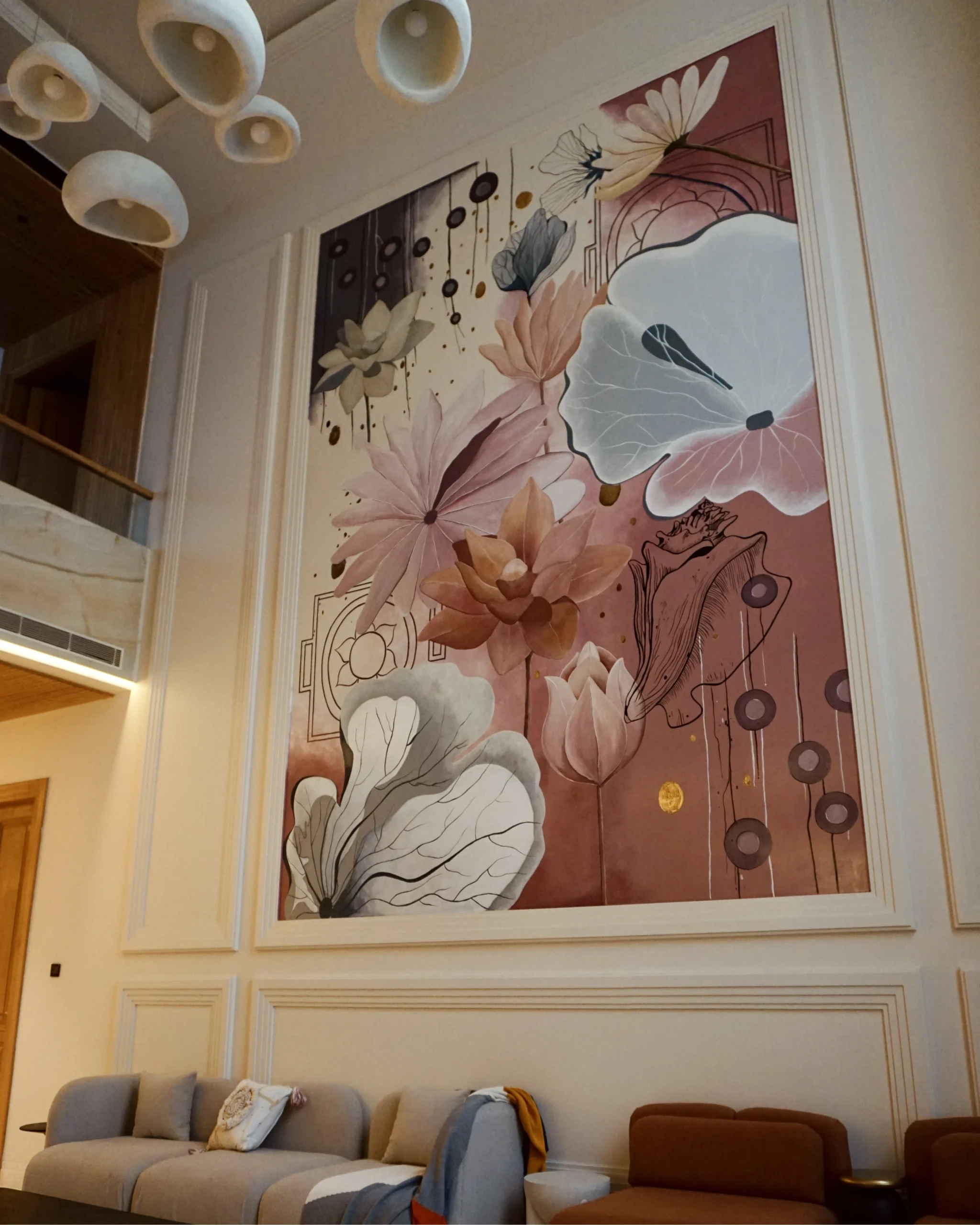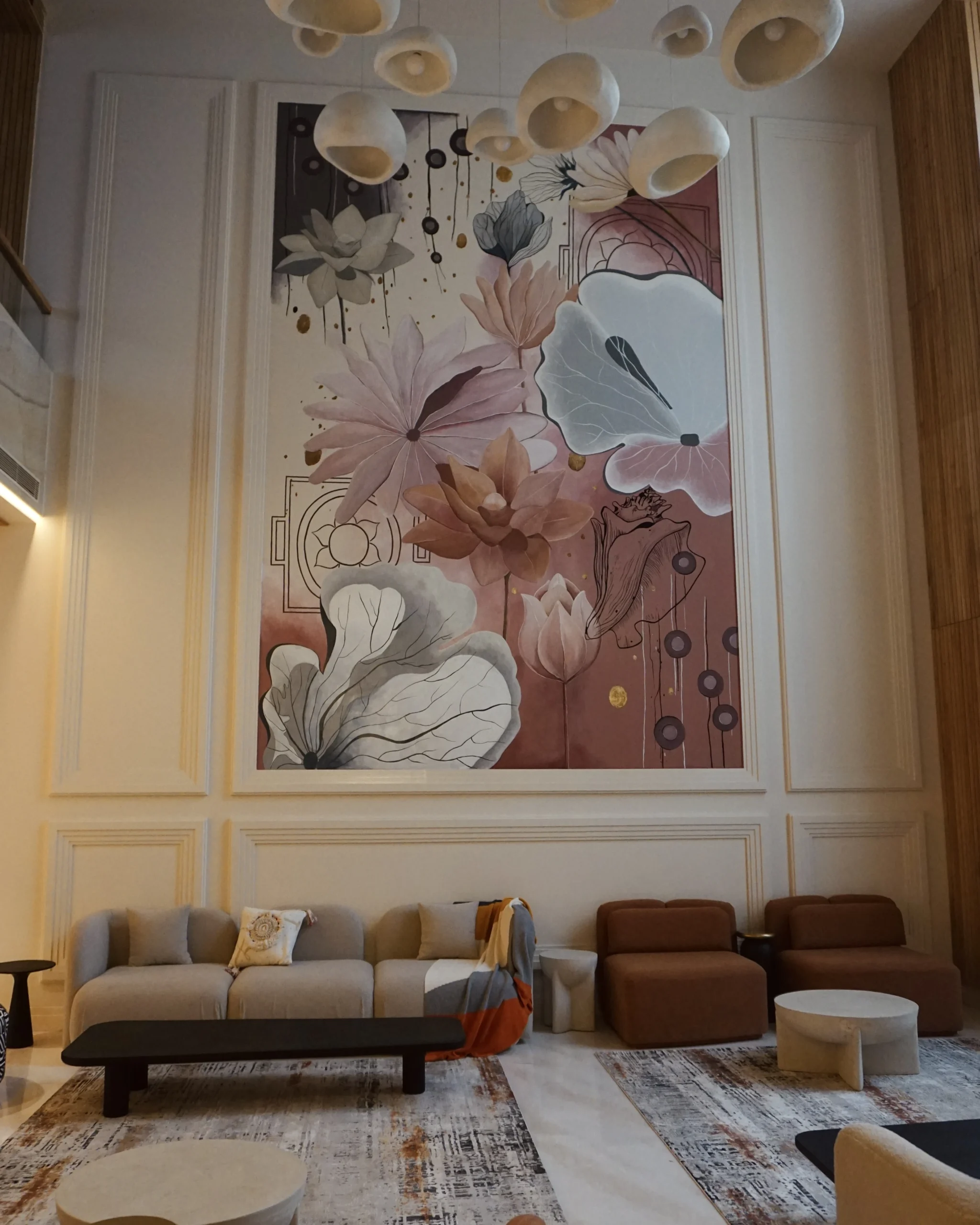 A double-height lotus mural anchors the living room. Layers of bloom in blush, mauve and grey, painted in a mix of rendered and linear styles that shift between solid and ethereal as the eye moves up the wall. Gold accents and falling orbs give it quiet movement.