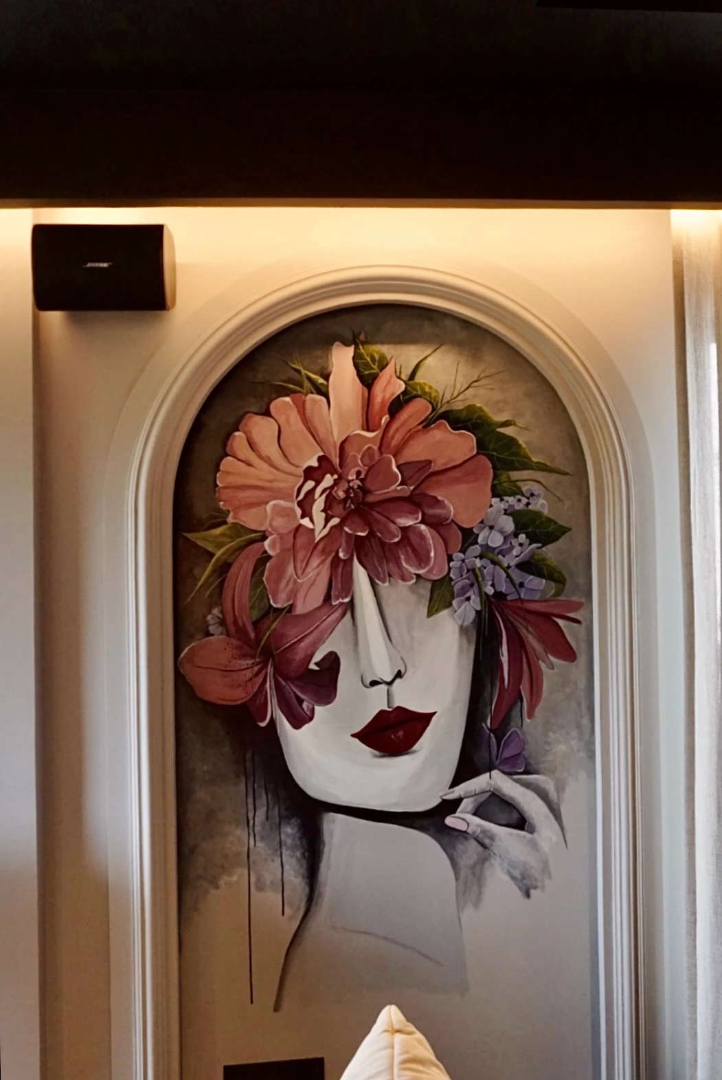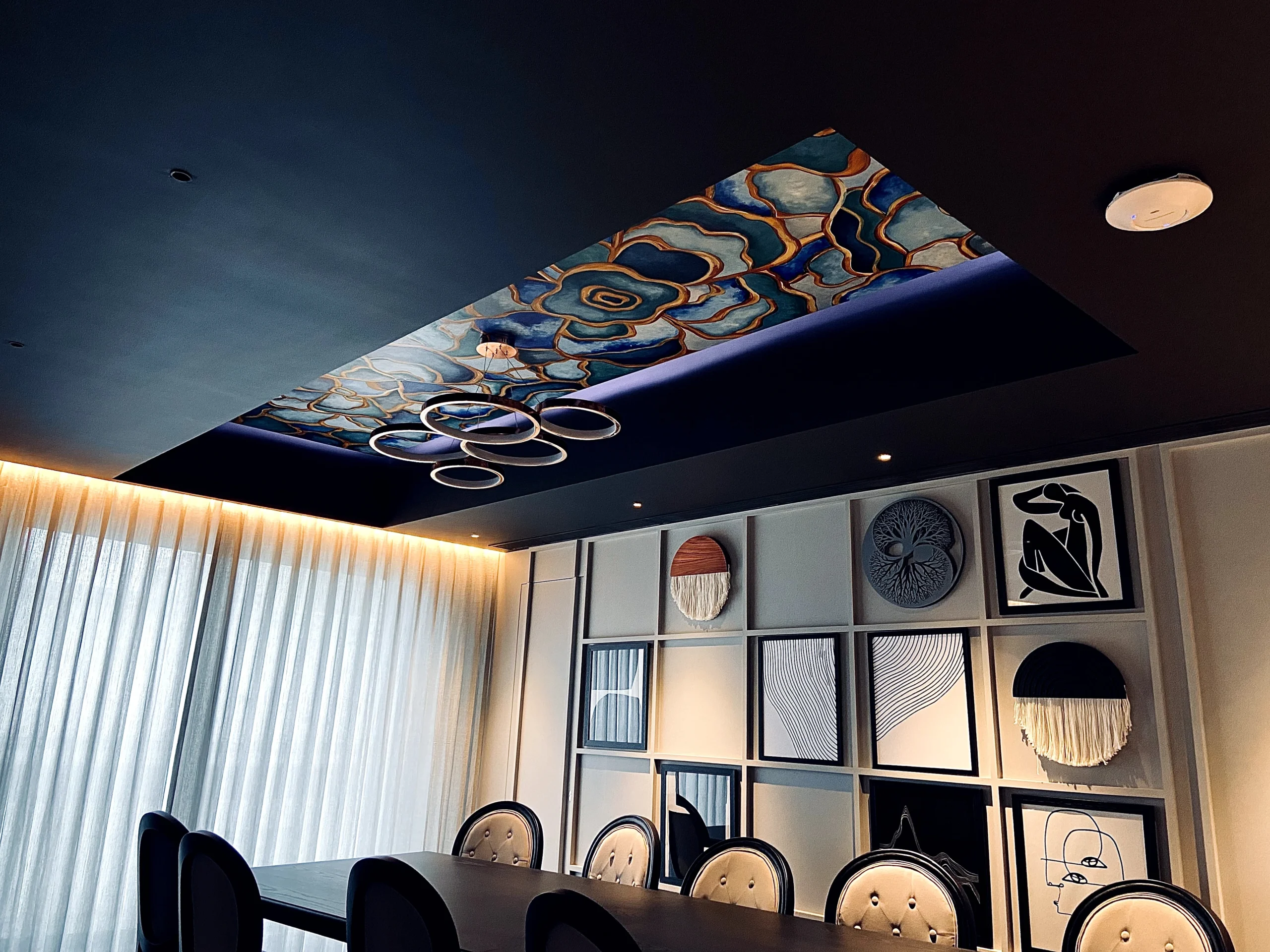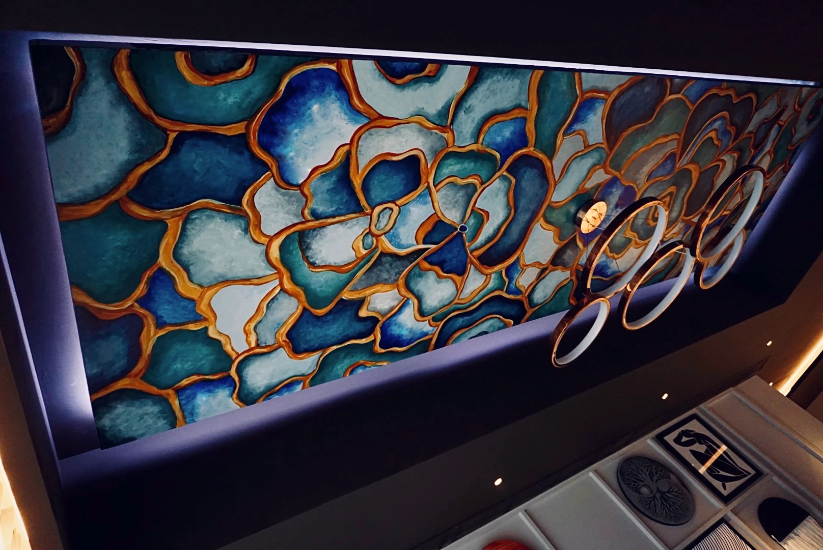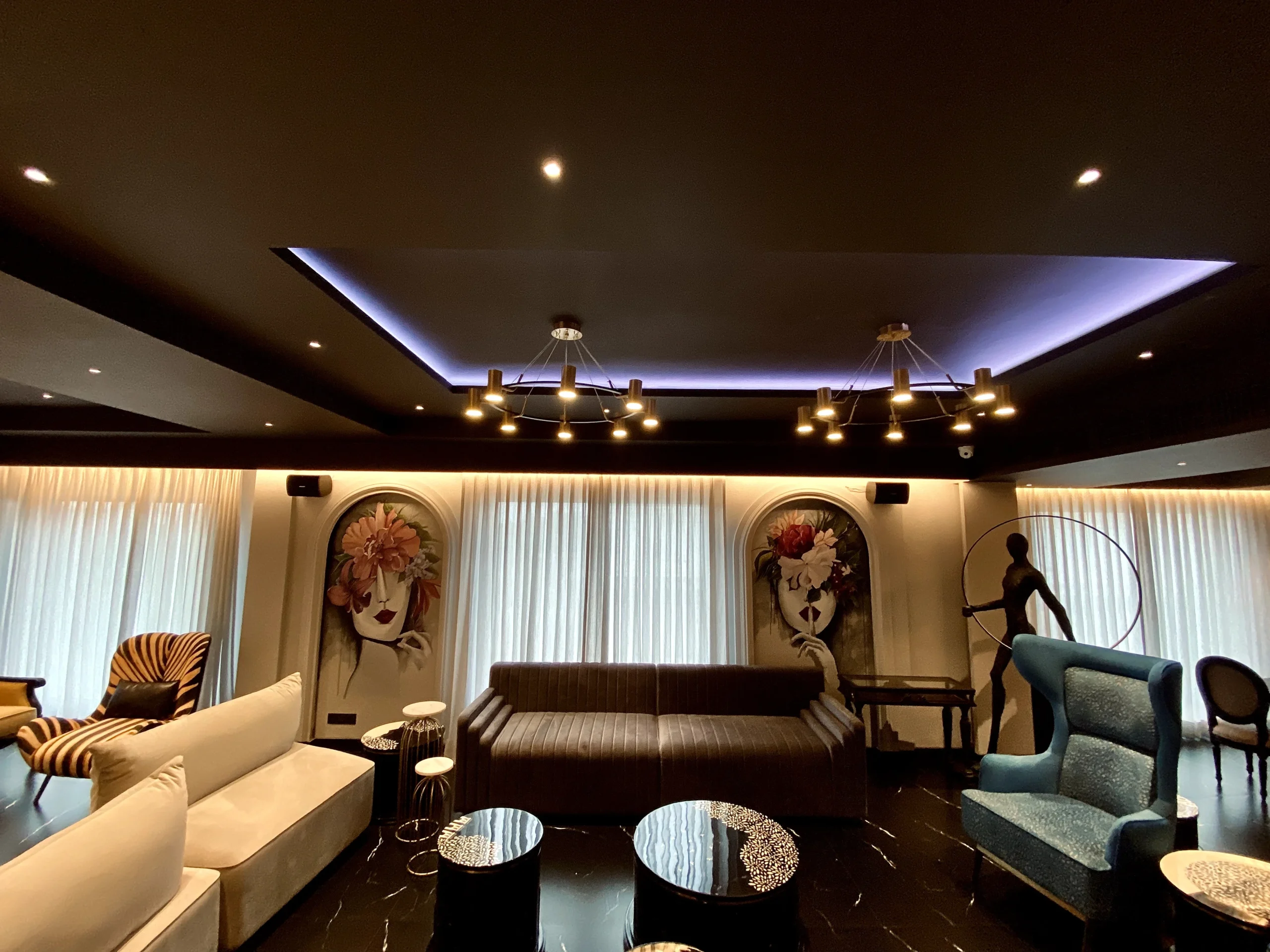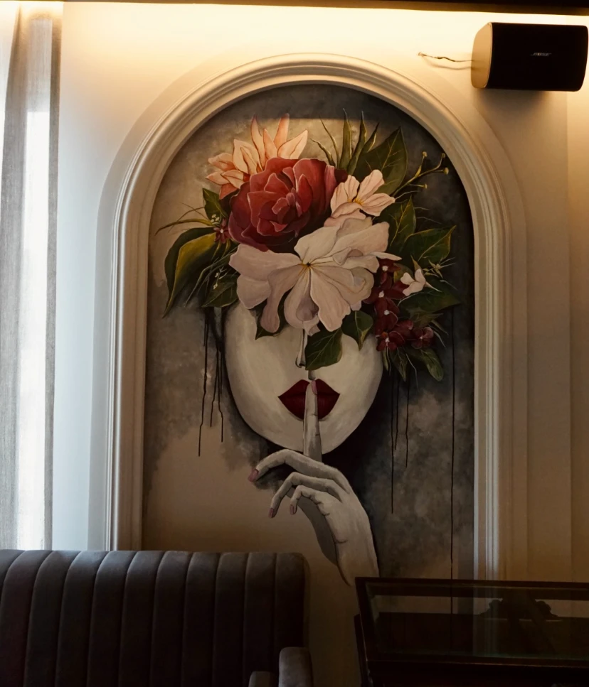 Two faces hidden behind blooms, painted into arched alcoves on either side of the room, composed and quietly commanding. The ceiling answers them, a dense spiral of teal and gold that closes the space overhead like a crown. A party lounge that feels like it was always meant to look this way.
