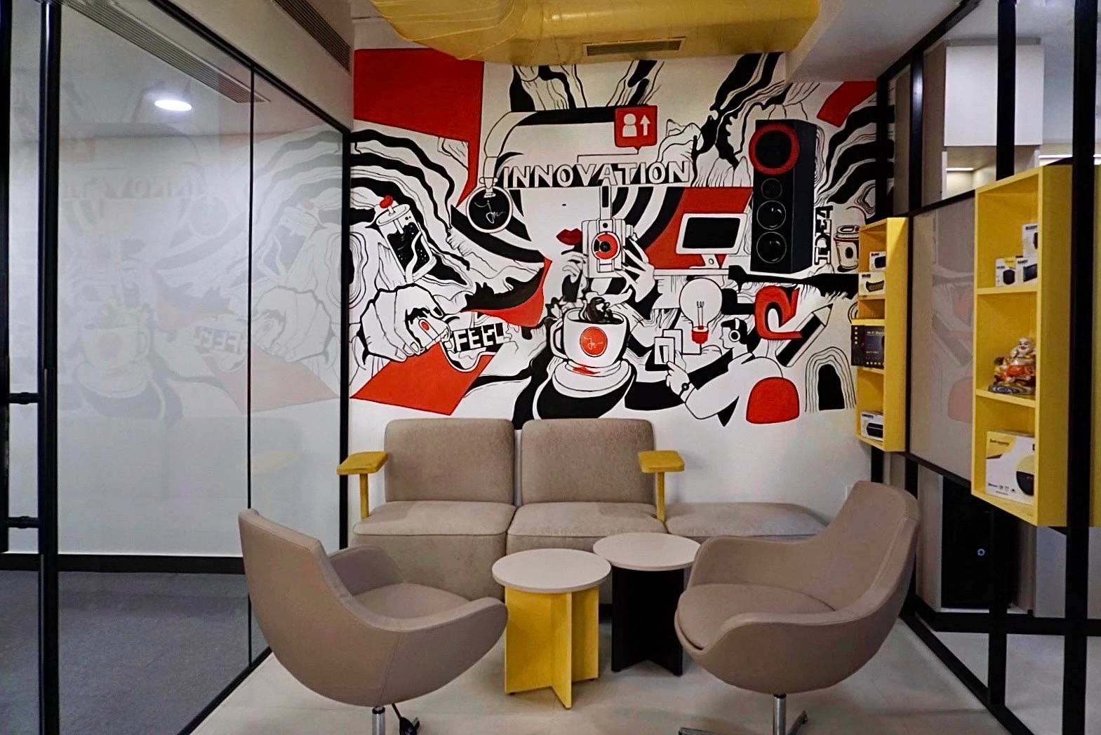 A pop-art mural built around the brand's identity. Bold linework in black, white and red, packed with energy. Cameras, coffee cups, lightbulbs, speakers and the word "Innovation" woven into a single dense composition. The kind of wall that makes a breakout room feel like a statement.