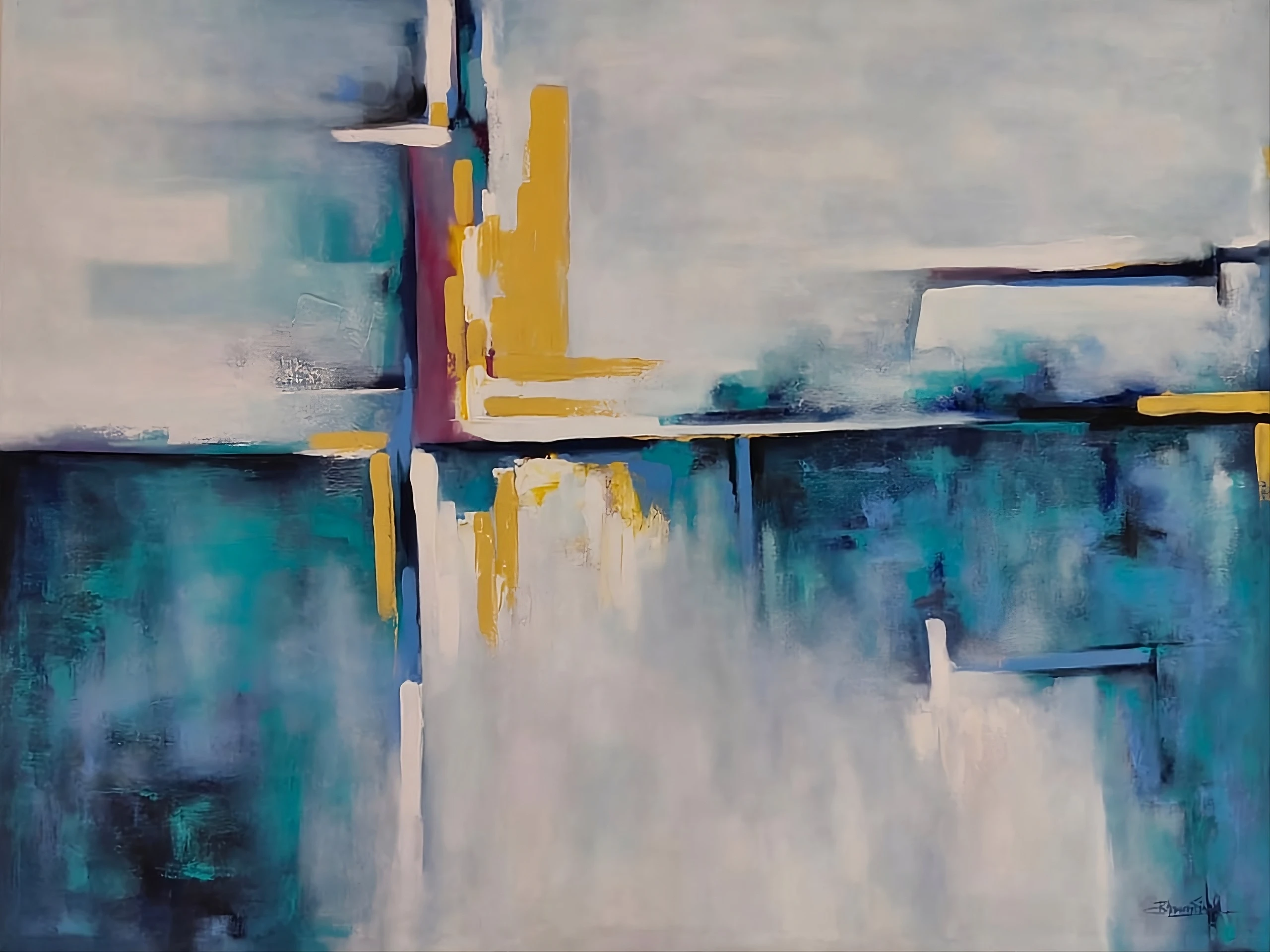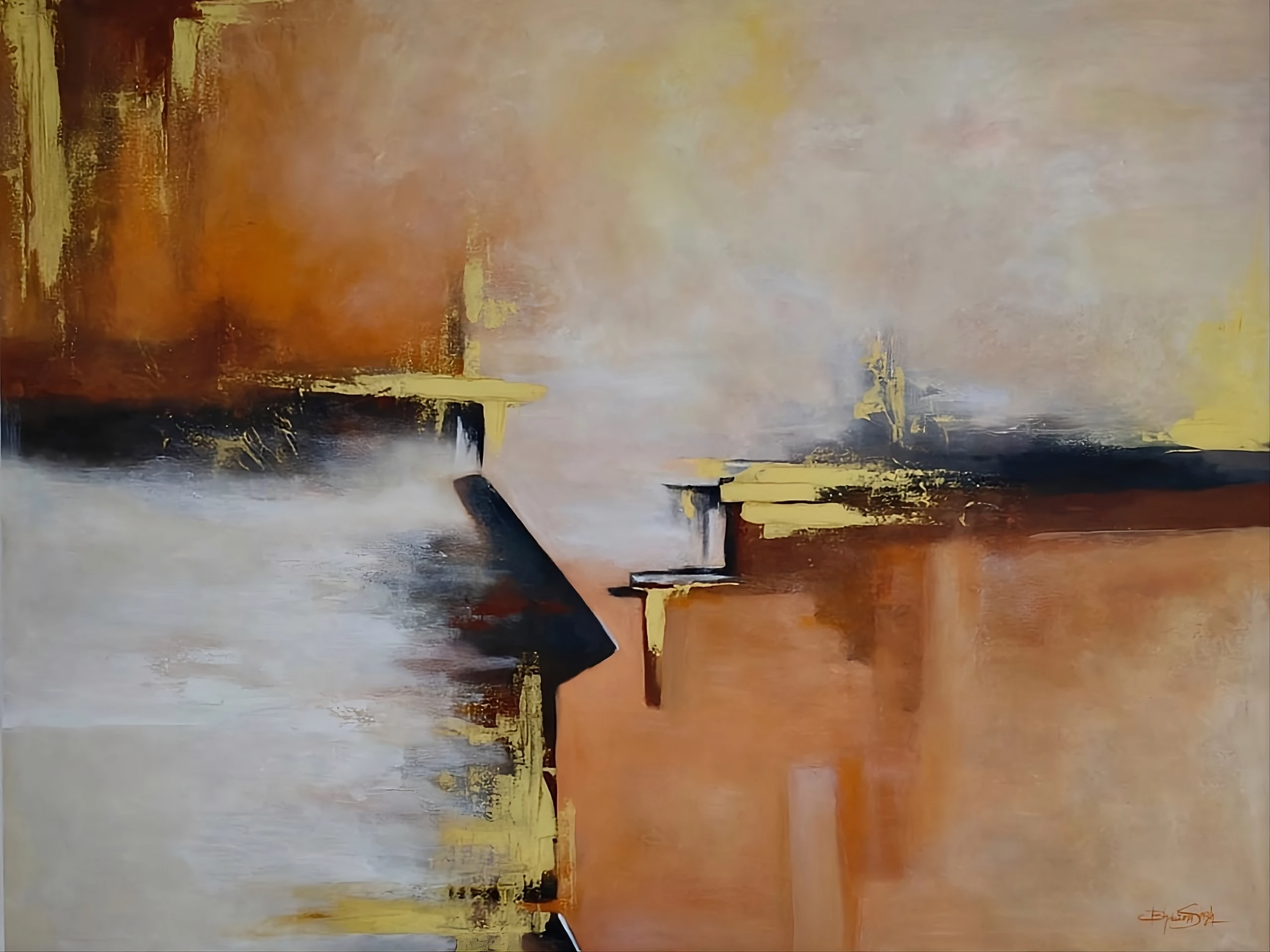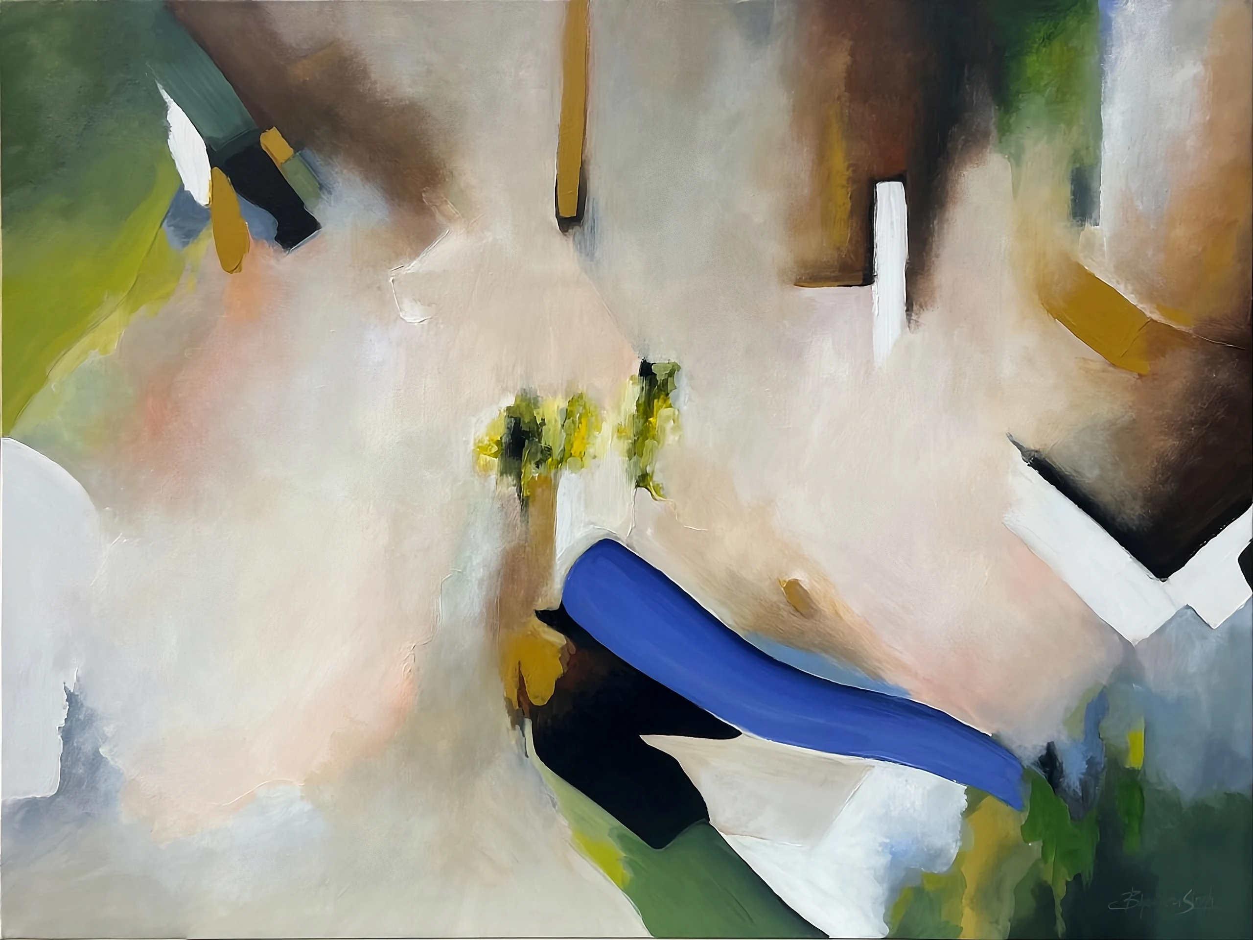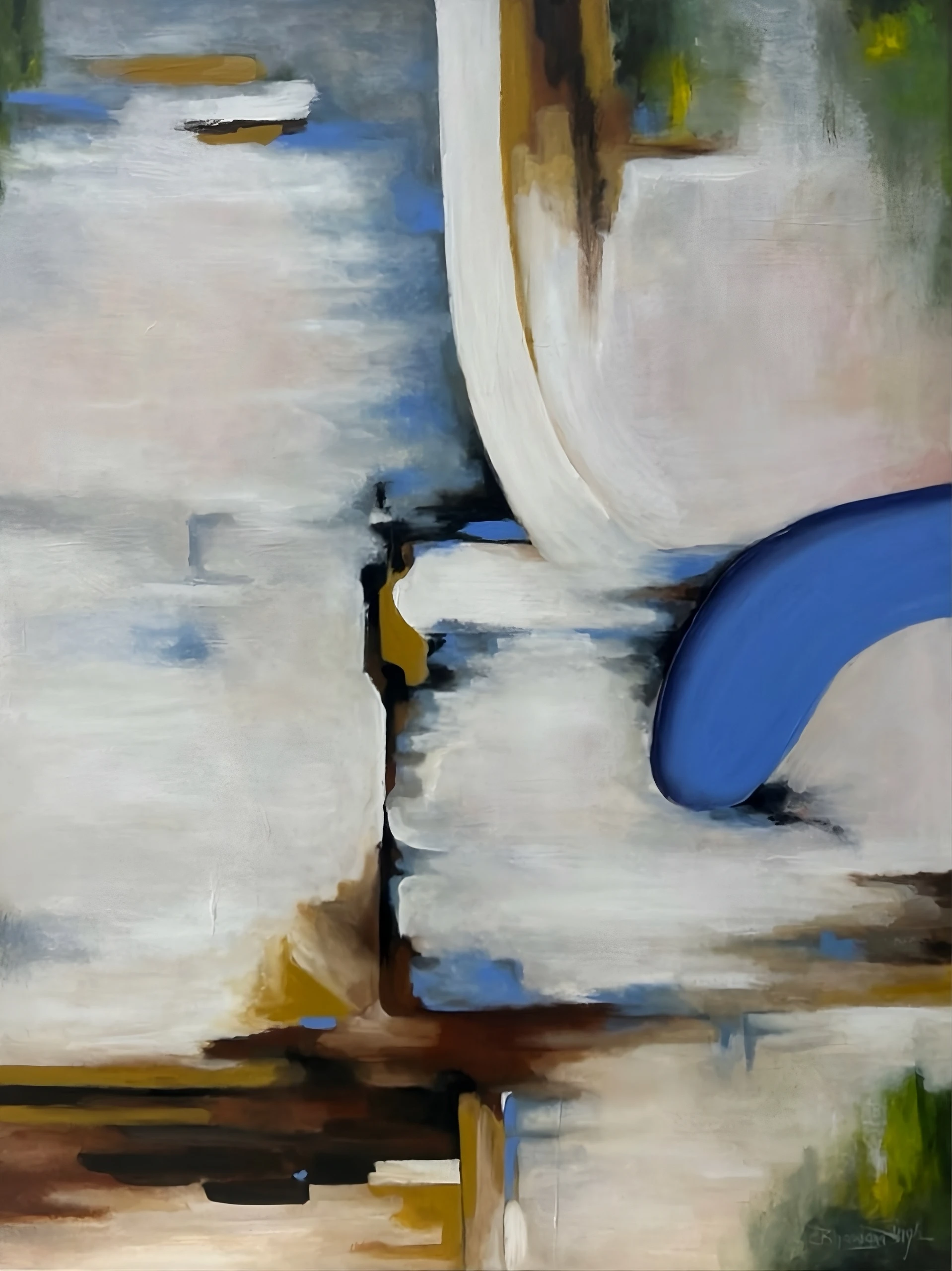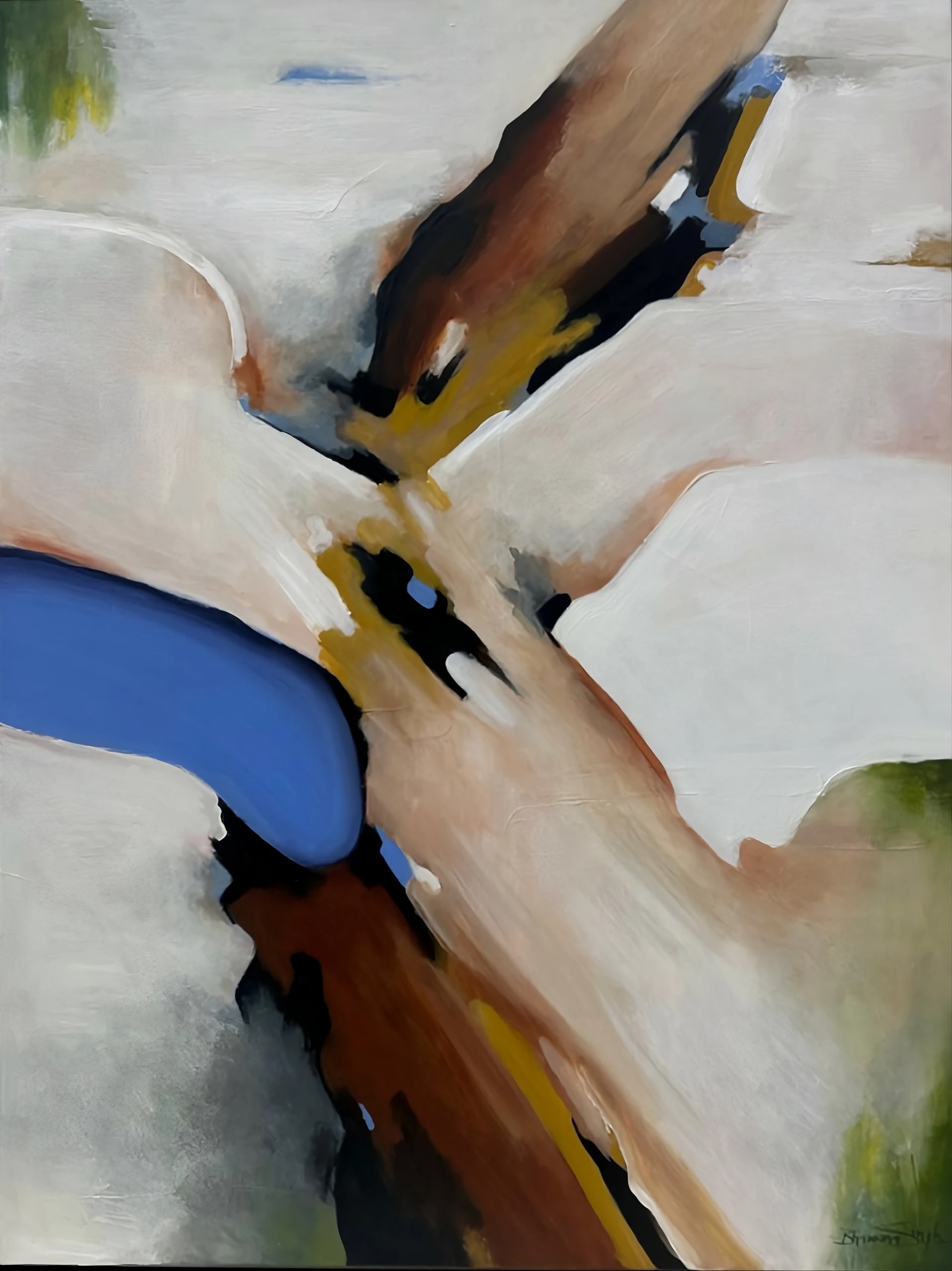 Fault Lines is rooted in the language of the earth. Tectonic shifts, fractured terrain, the kind of pressure that builds over time and leaves its mark on everything above it. These five paintings borrow from that world, the weight of it, the rawness, the sense that something massive has moved and settled. The palette runs deep, ochres and burnt earth punctuated by a cool, stubborn blue that holds its ground across the series. It is confident work, built for spaces that can hold it.