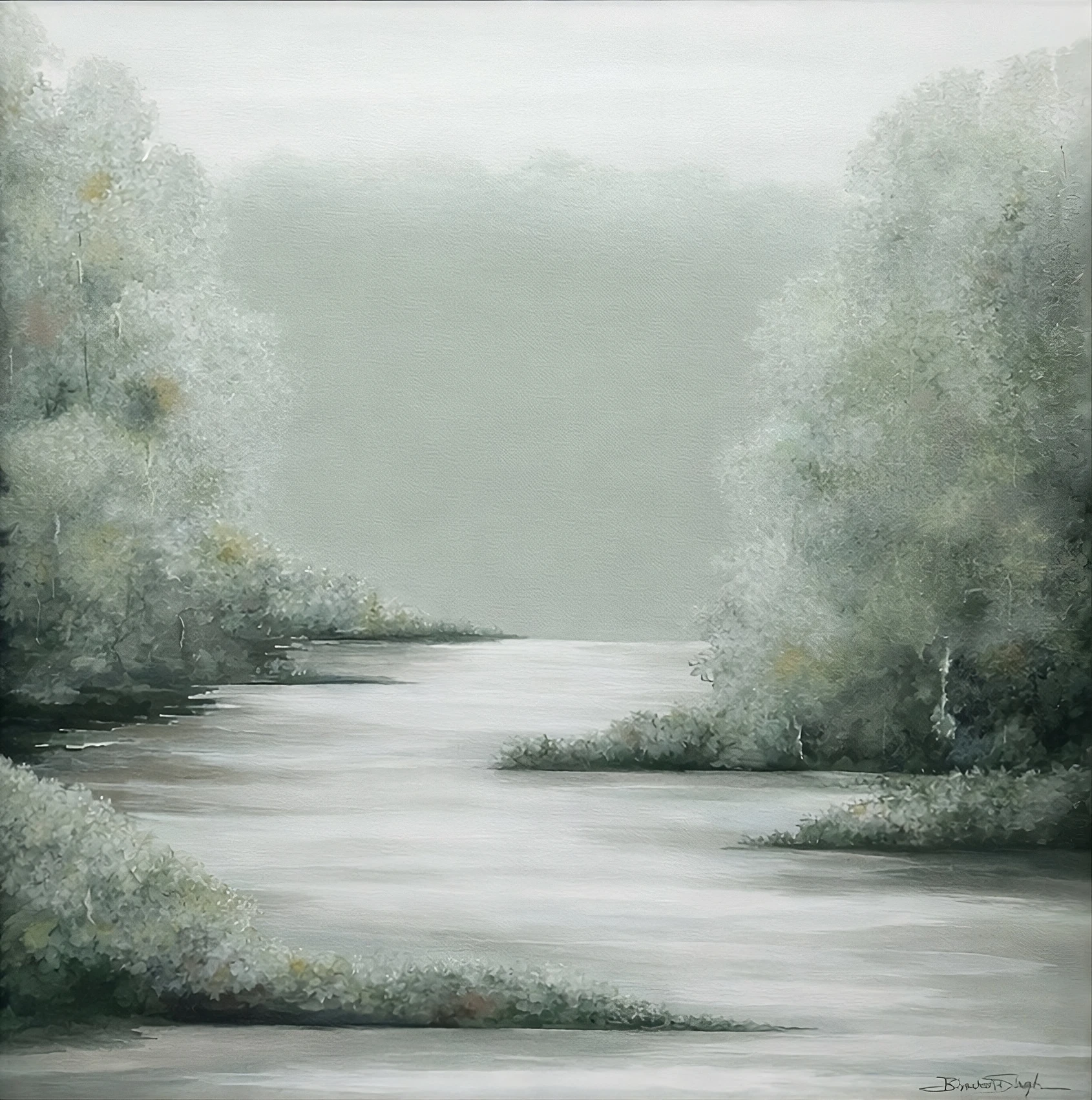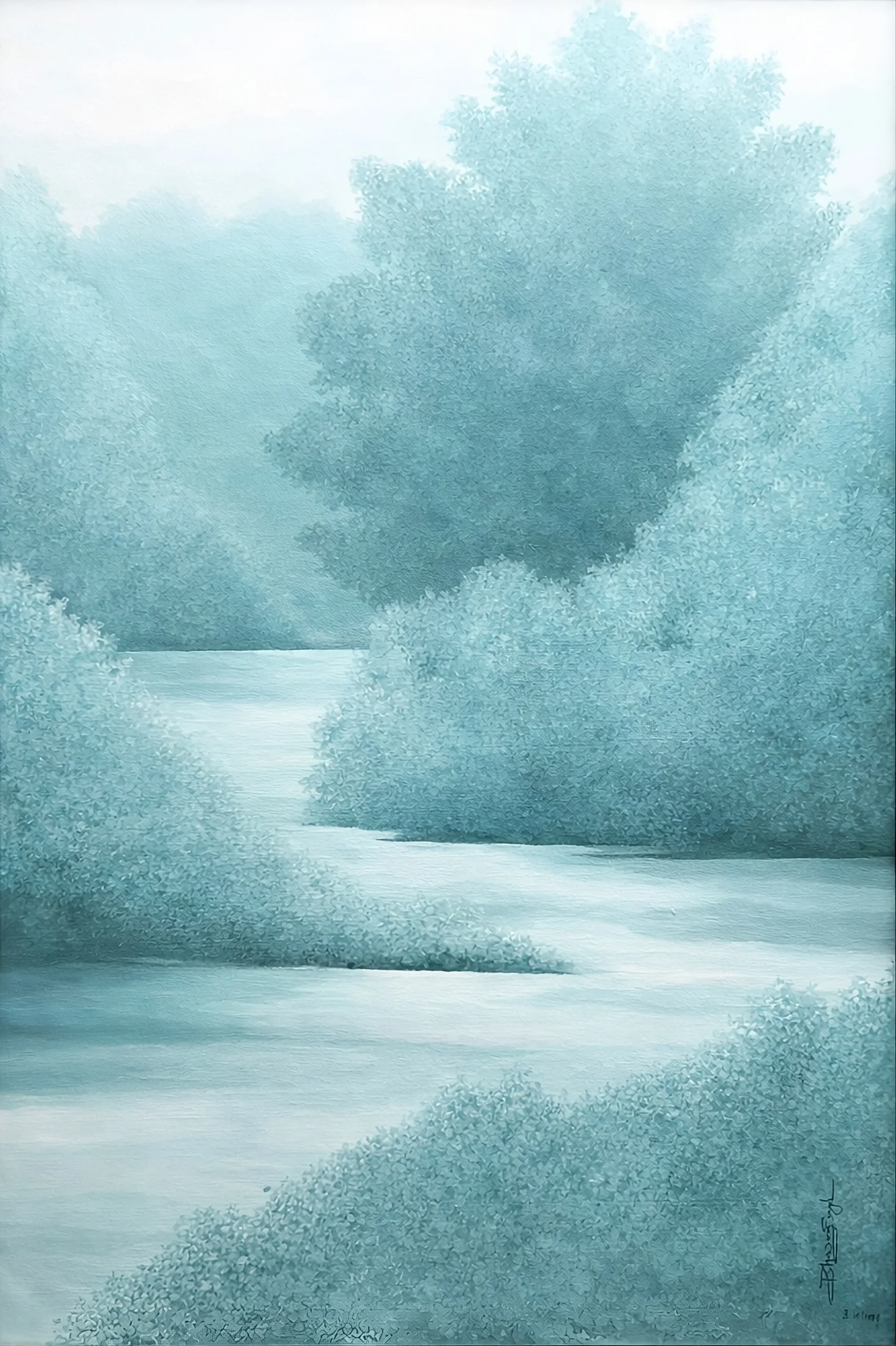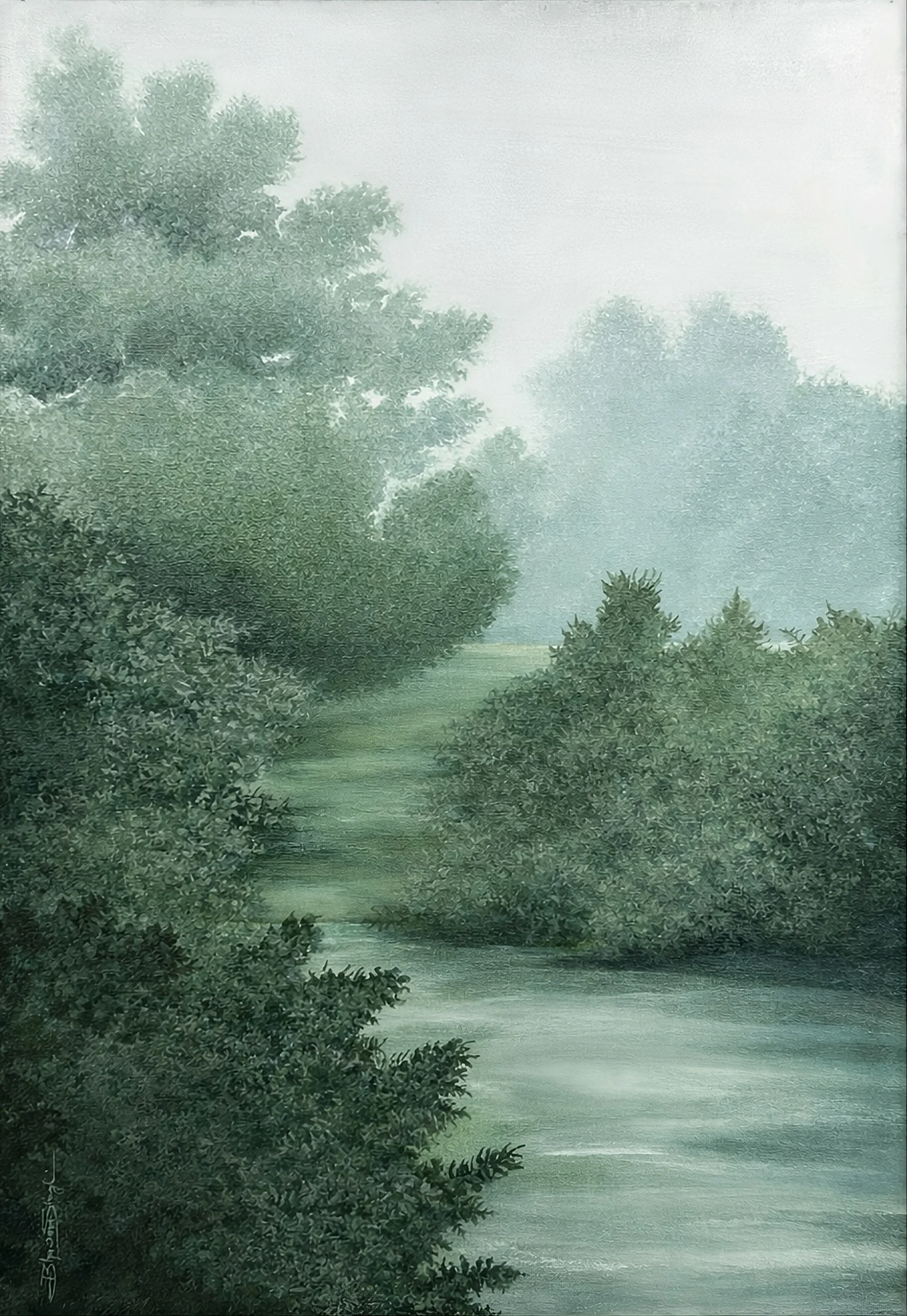 Whispers of the Mist is a series of quiet landscapes where time seems to lose its edge. Rivers dissolve into fog, forests soften into something between memory and dream. There is no drama here, no sharp light or hard line. Just the stillness that settles over a place in those few minutes before the world fully wakes or finally rests. The palette moves through blues, greens and sepia, always shifting the way light does at dawn or just before dusk. Each painting is built through careful layering, tone finding tone, until the atmosphere feels less painted and more arrived at.