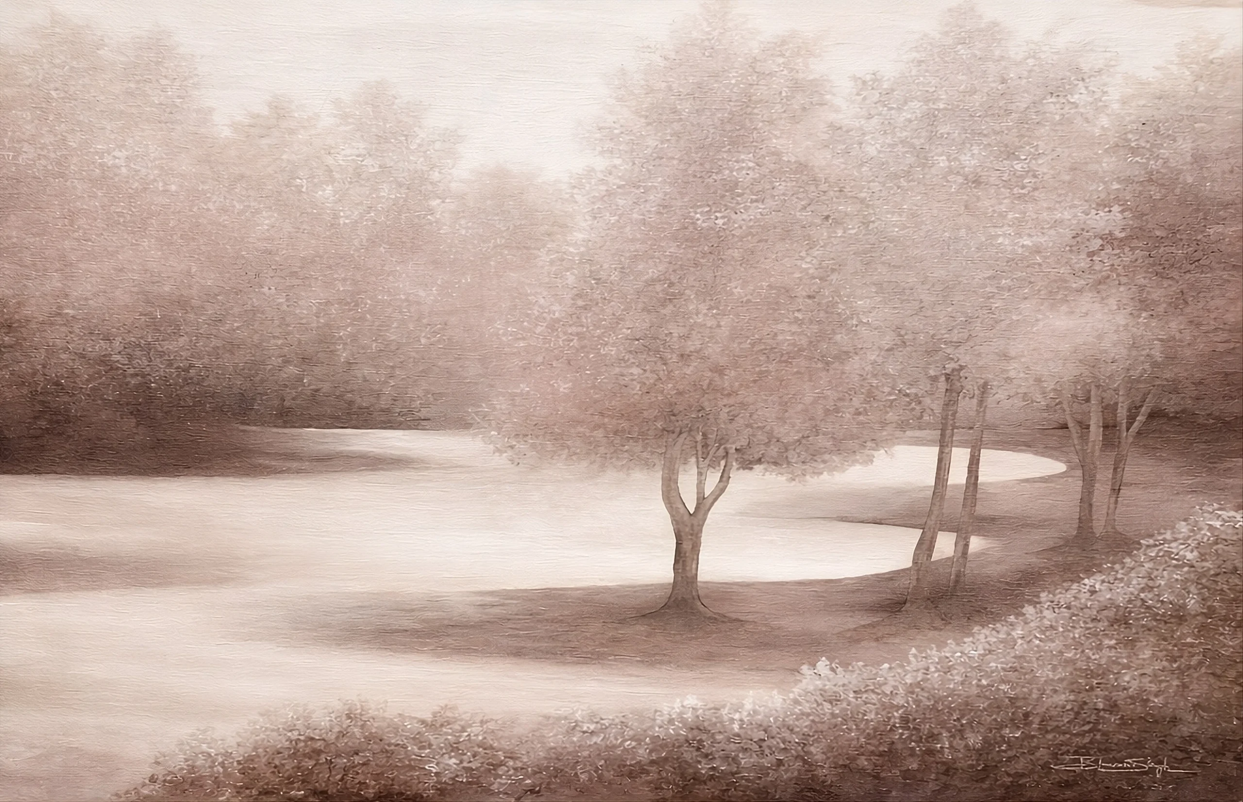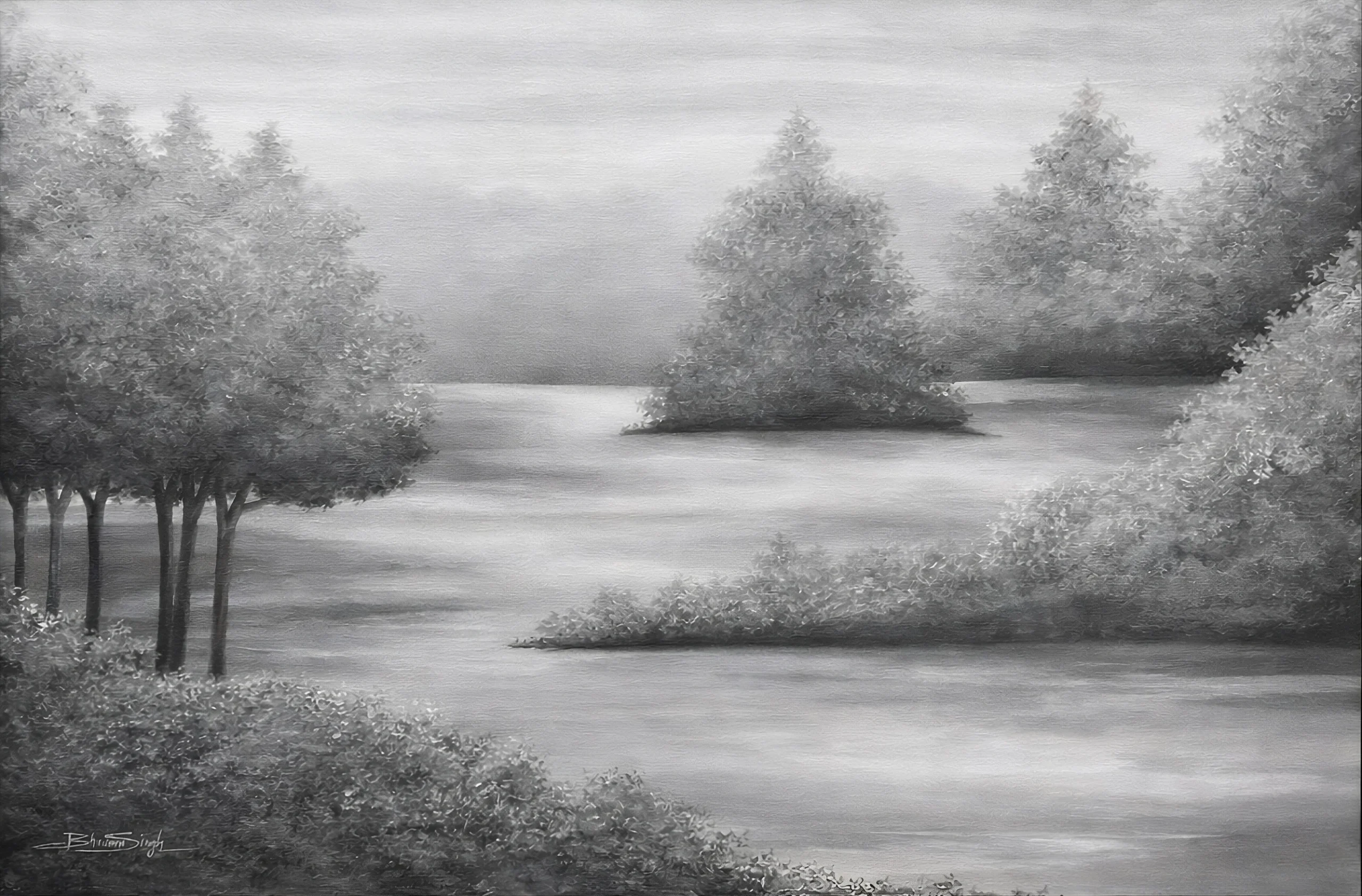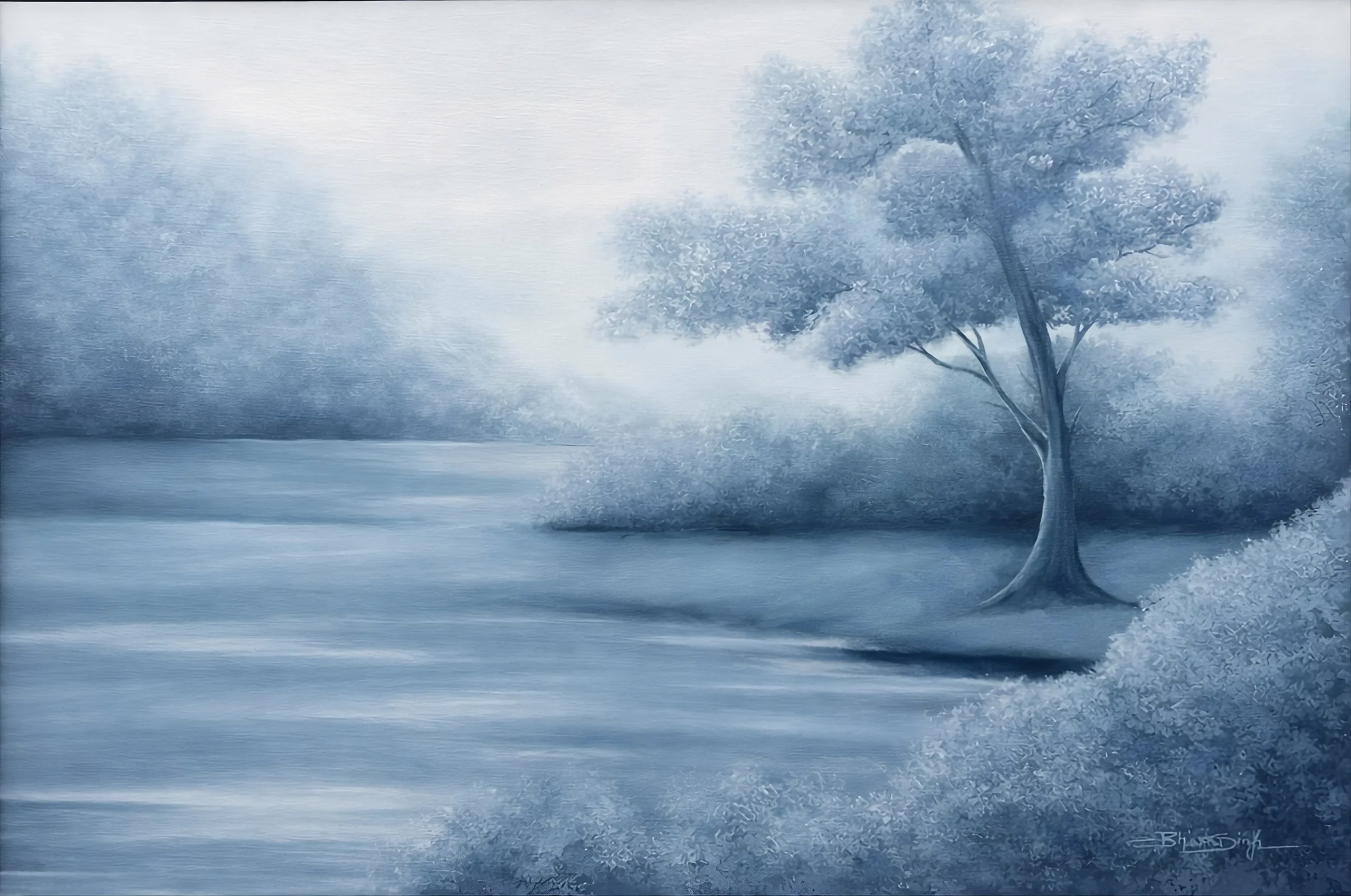 Whispers of the Mist is a series of quiet landscapes where time seems to lose its edge. Rivers dissolve into fog, forests soften into something between memory and dream. There is no drama here, no sharp light or hard line. Just the stillness that settles over a place in those few minutes before the world fully wakes or finally rests. The palette moves through blues, greens and sepia, always shifting the way light does at dawn or just before dusk. Each painting is built through careful layering, tone finding tone, until the atmosphere feels less painted and more arrived at.